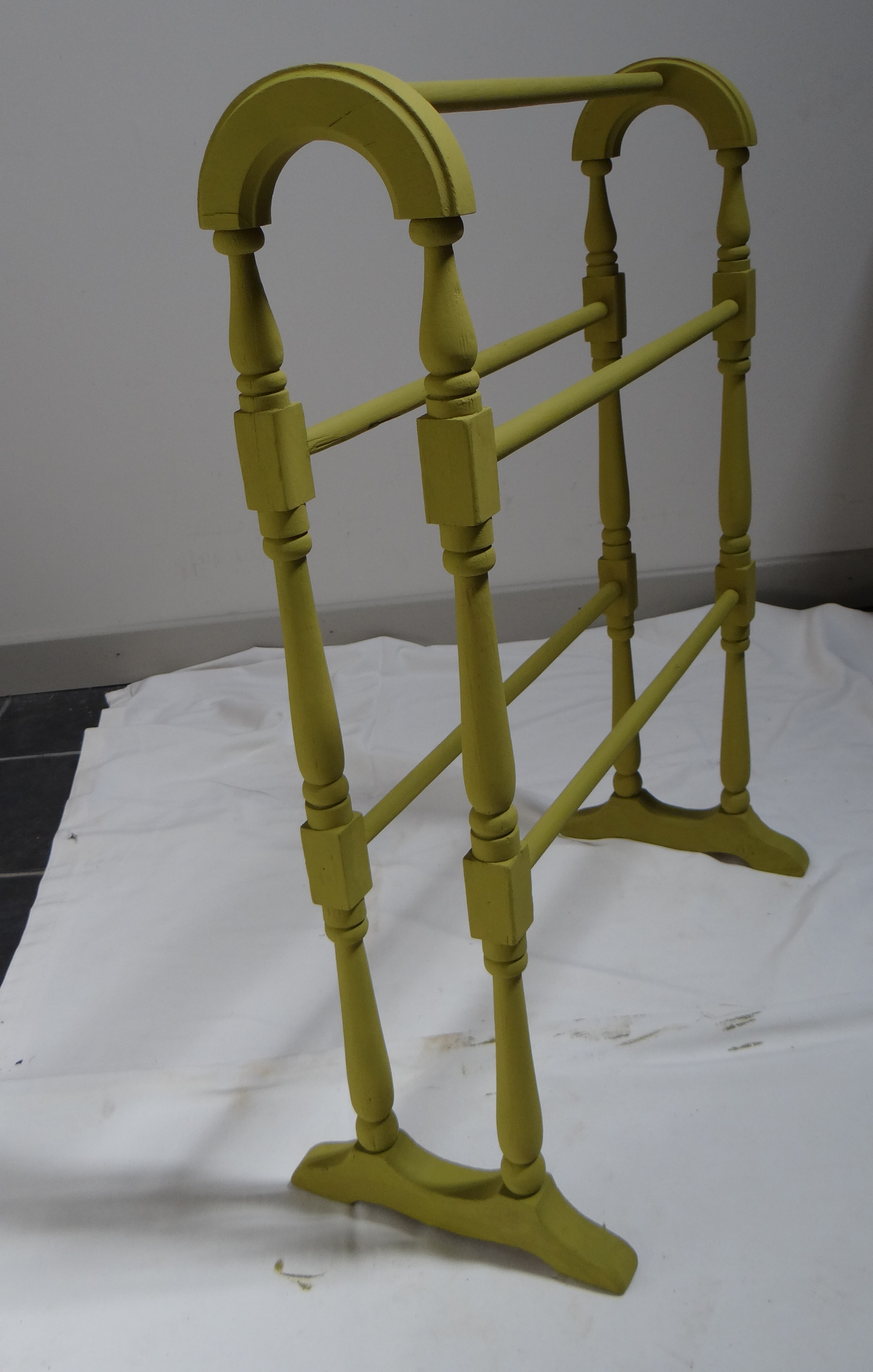 Now the downside of a towel rail is, with time, the wax wears and the rails get discoloured with wet towels. Enter Frenchic! I had read a bit about these new paints which require little or no preparation and transform all kinds of furniture. Yeah baby, you are talking my language. So off I went to our local stockist Country Wood at Househill Courtyard, nr Nairn. Ten minutes later I am leaving with one wee pot of Pea Soup (the paint that is, not my lunch) and a bottle of finishing coat.